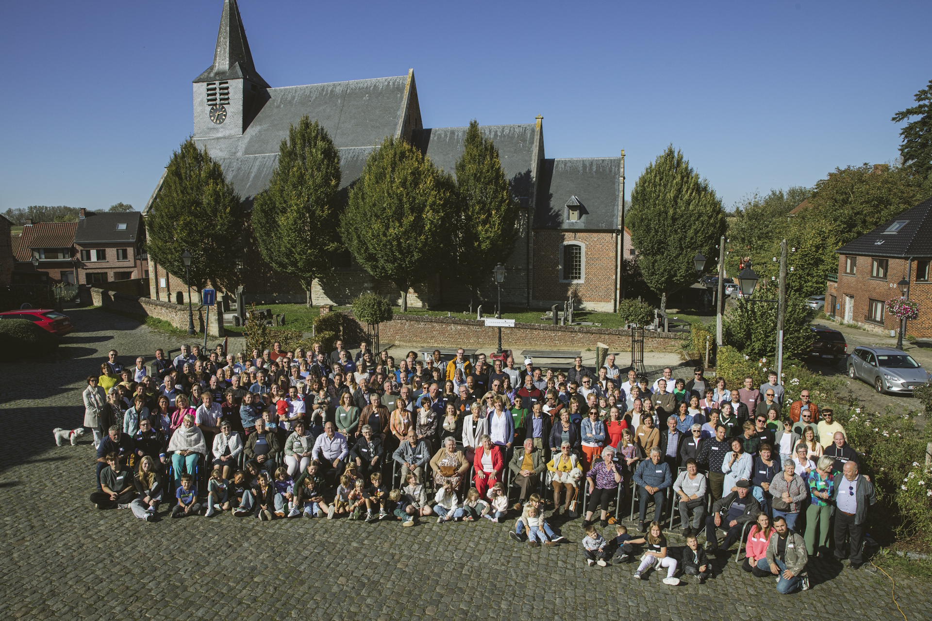 Zondagnamiddag was het dan zover. Rond 14 uur verzamelde zich het overgrote deel van de dorpsbewoners op het dorpsplein. Onder een stralende zon trachtte ceremoniemeester van dienst Koen Baert de mensen zodanig bij elkaar te plaatsen dat iedereen op de foto raakte. Fotografe Marie Lambrecht legde alles op de gevoelige plaat. De jongste en oudste aanwezige inwoner werden verwend met een extra attentie. Na afloop kon iedereen zijn geschenkje afhalen in het buurthuis. Het mooie weer liet toe dat iedereen nog uitgebreid kon bijpraten aan de bar op het dorpsplein. Toen om 18 uur een regenbui langskwam werd het tijd om weer huiswaarts te trekken. Dit was weerom een geslaagde editie dankzij de belangeloze inzet van vele dorpelingen en dankzij initiatiefnemer Jos.
